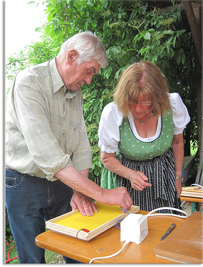 Zur Honiggewinnung wird das Hilgerhof-Bienenhaus zwar mit einer modernen motorisierten Honigschleuder ausgestattet; damit man den Vorgang aber besser erkennen kann, wurde an diesem Tag jedoch eine traditionelle mit Handkurbel betriebene Schleuder in Gang gesetzt und jeder konnte den aus dem Hahn fließenden frischen Honig probieren. Interessant war auch, wie der Imker aus dem Wachs seiner Bienen Wachsplatten fertigt – in der Imkerfachsprache Mittelwände genannt - und sie durch Anschmelzen in die Rähmchen einpasst, die in die Kästen für die Bienen eingehängt werden, damit die Bienen schön regelmäßig daran weiterbauen. An diesem Tag am Hilgerhof konnte aber auch beobachtet werden, wie die Bienen in den früher üblichen Bienenkörben nach eigenem Muster ihre Waben bauen – ein Bienenkorb stand an der Spitze eines kleinen Zeltes,